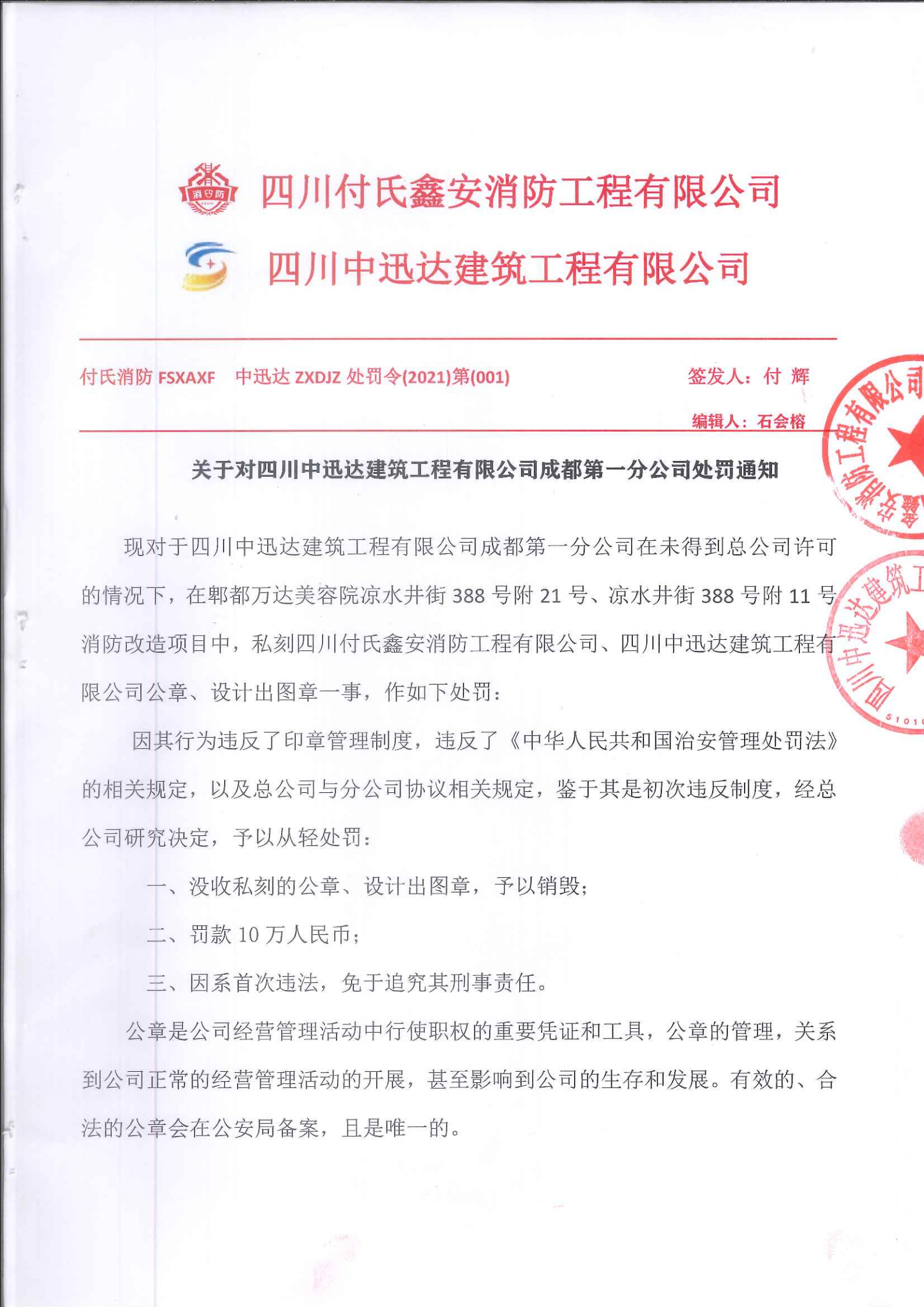 關(guān)于對(duì)四川中迅達(dá)建筑工程有限公司成都一分公司處罰通